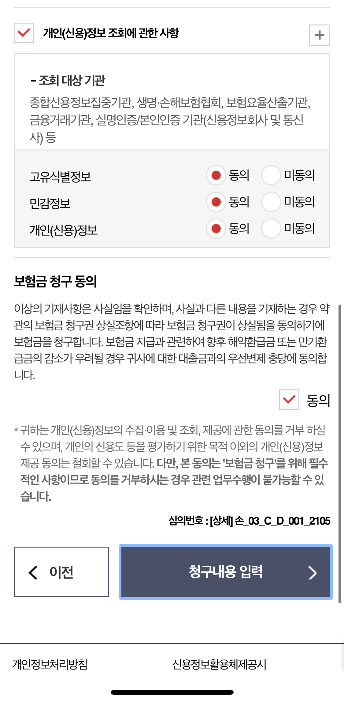 그리고 신규 청구에 체크하여 보험금 청구하기로 들어갑니다. 이때, 이전에 이미 청구한 내역을 보완하거나, 동일한 질병으로 병원에 재방문하였을 경우 각각 서류보완, 추가 청구를 할 수 있습니다. 그리고 각종 동의서에 동의 체크를 하고 청구내용 입력으로 들어갑니다.
