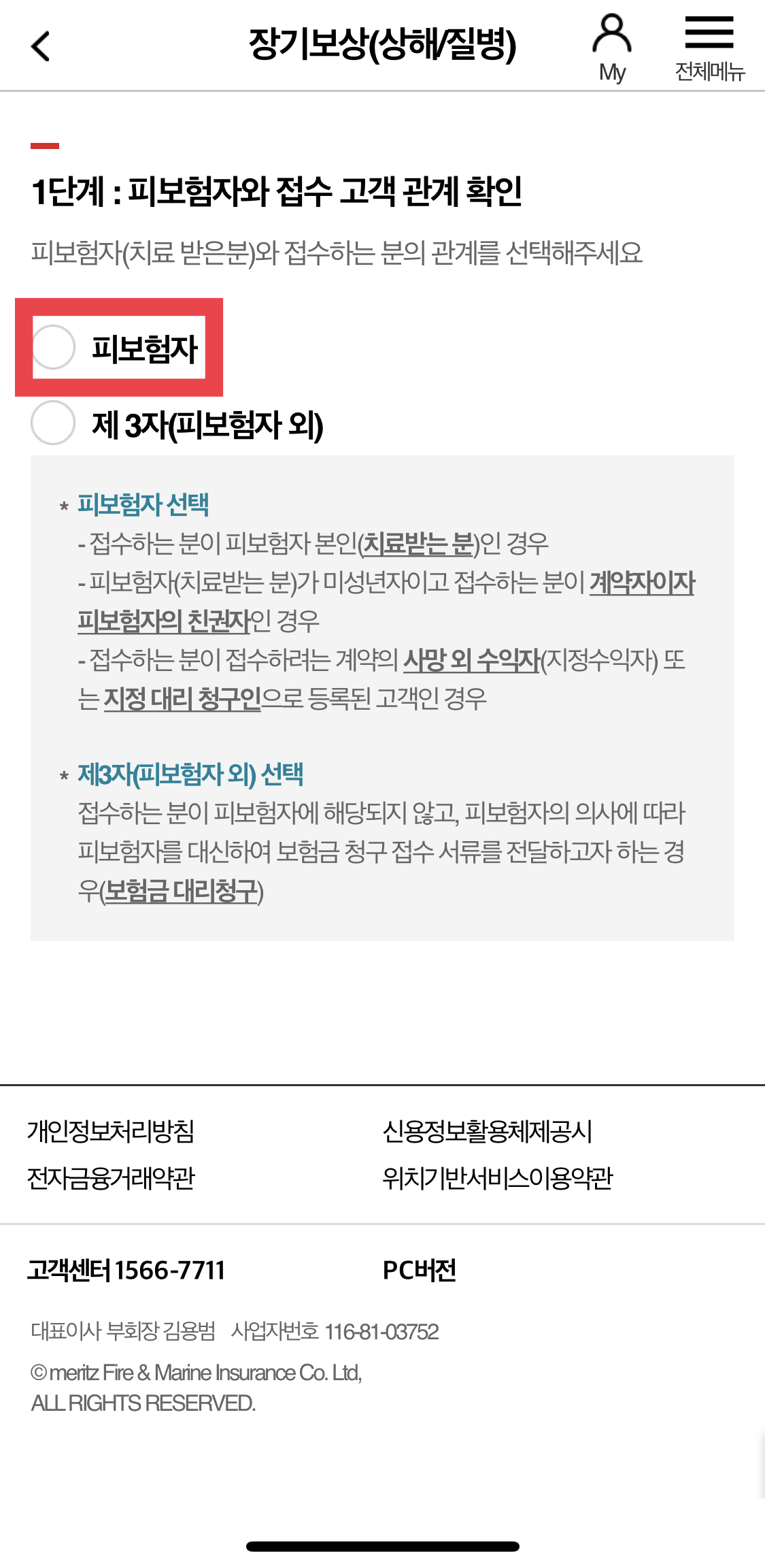 1단계 피보험자와 접수 고객 관계 확인에서 본인이기 때문에, 피보험자를 선택합니다.