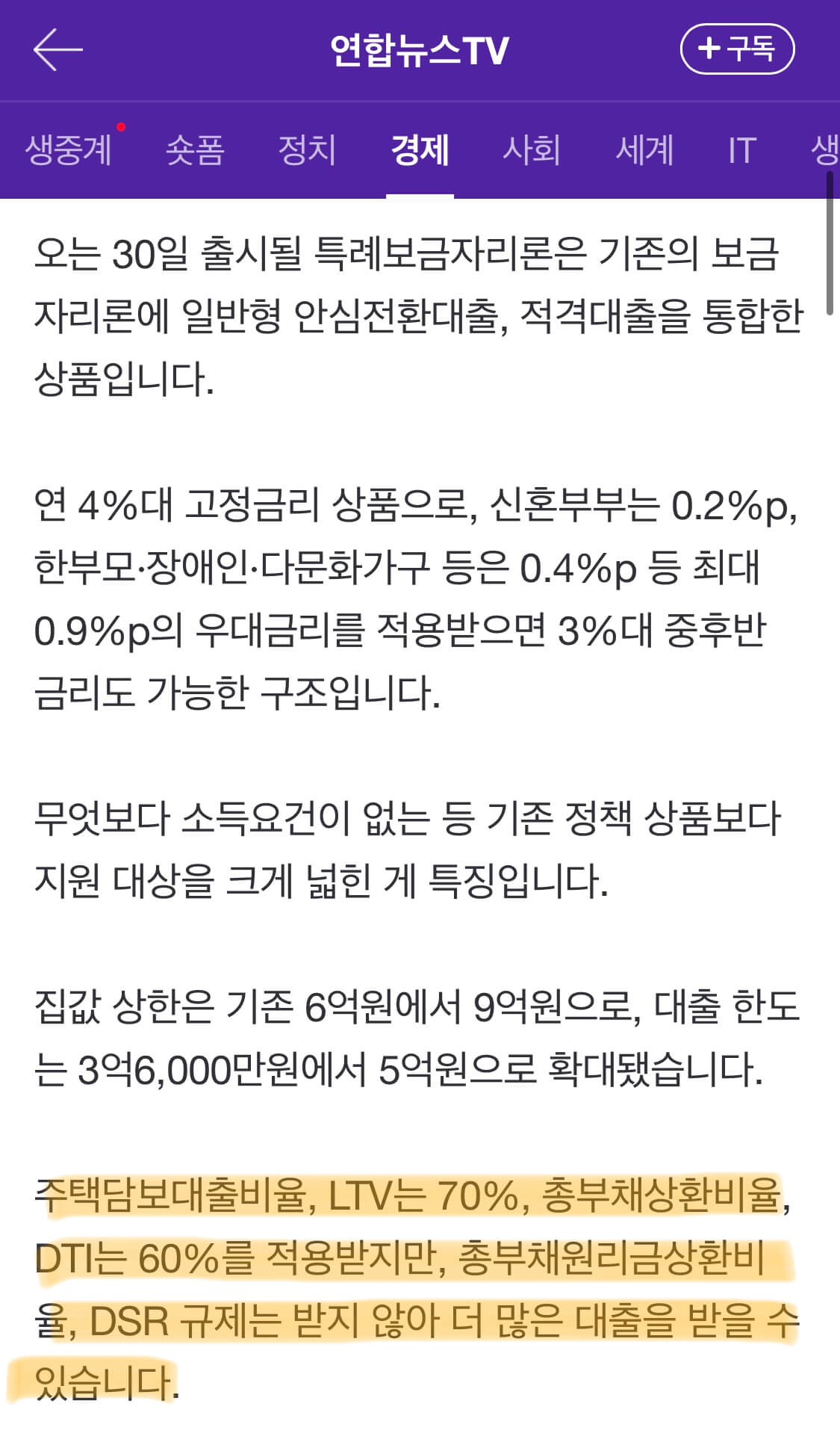 1월 30일부터 신청가능한 특례보금자리론에 관한 신문기사입니다. 기사에 LTV는 70%라고 되어있습니다.