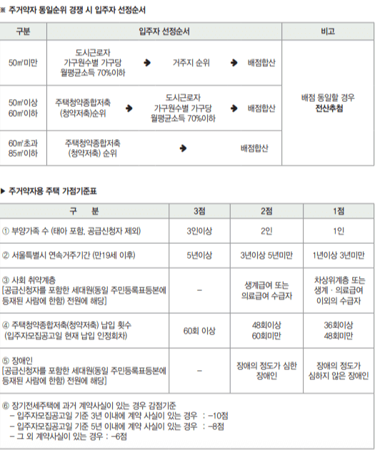 동일순위 경쟁 시 입주자 선정순서 및 가점기준표